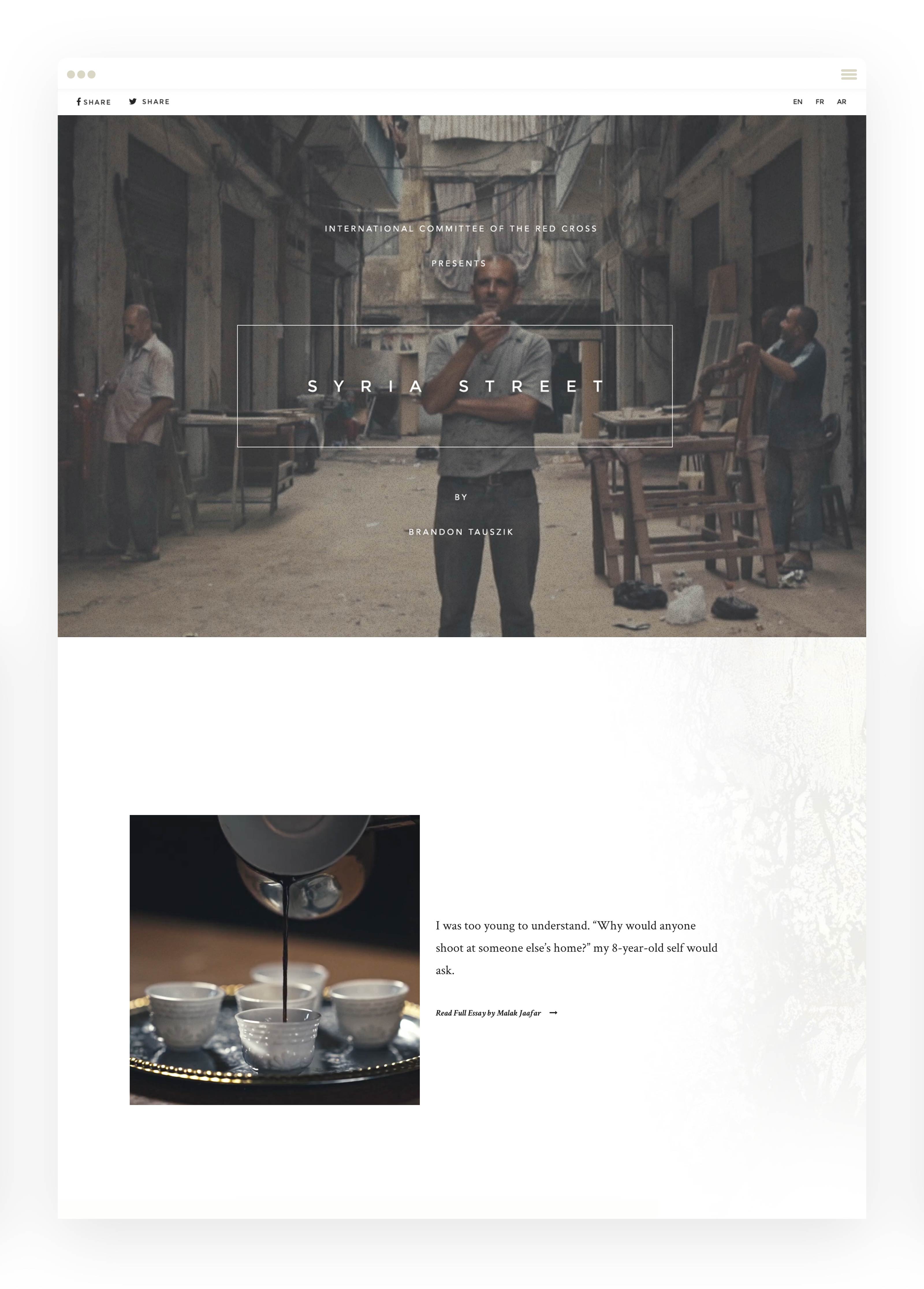 Working with photographer Brandon Tauszik, we showcased the work ICRC was doing in Lebanon and told the stories of people living through the chaos of civil war. The page featured high-quality animated imagery that captured movement and emotion, giving users a window into a world most would never see.